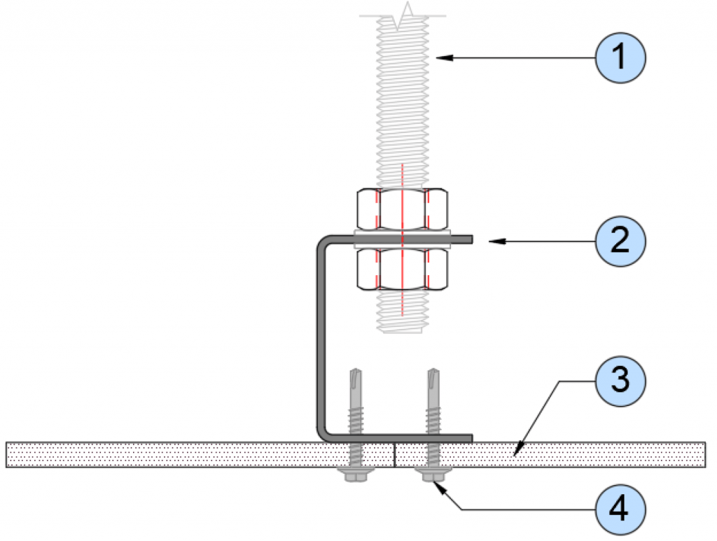 Primary channels at 1200mm maximum centres, supported from building structure above the ceiling membrane with steel drop rods at 1.5m centres. Threaded rods pass through clearance holes in the upper flange of the channels and are fastened with steel hexagon full nuts.